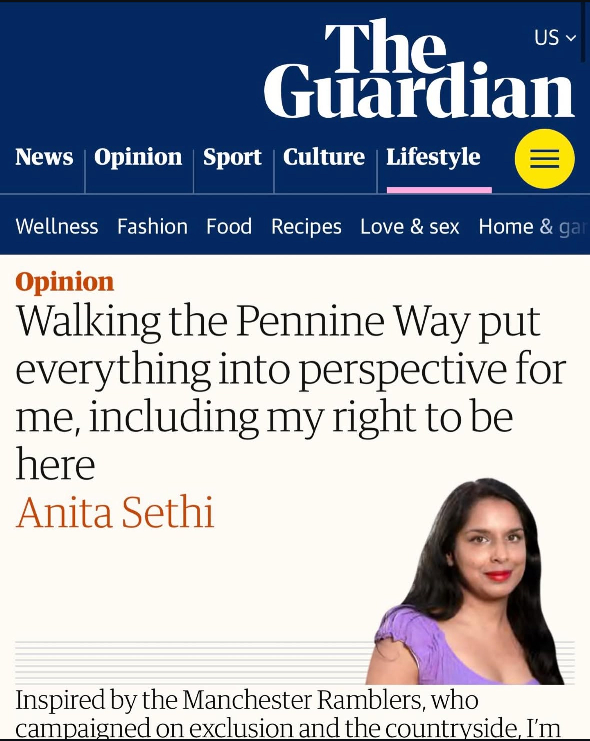 column in the Guardian April 27, 2025May 27, 2025 by Anita Sethi, posted in Writing I wrote a column in the Guardian – a love letter to the Pennine Way as it celebrates its 60th anniversary. (20th April 2025) Share this: Click to share on Facebook (Opens in new window) Facebook Click to share on X (Opens in new window) X Like Loading... Related