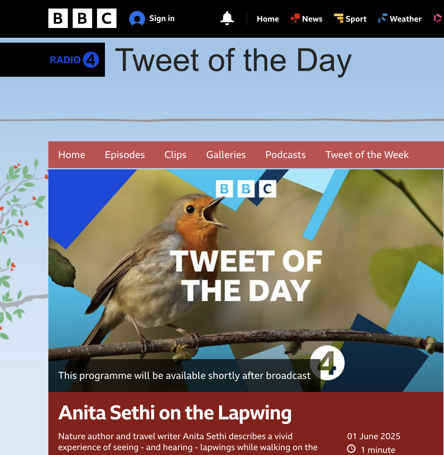 BBC Radio 4 – Tweet of the Day – Anita Sethi on the Lapwing (broadcast 1st June 2025) https://www.bbc.co.uk/programmes/m002cz7t