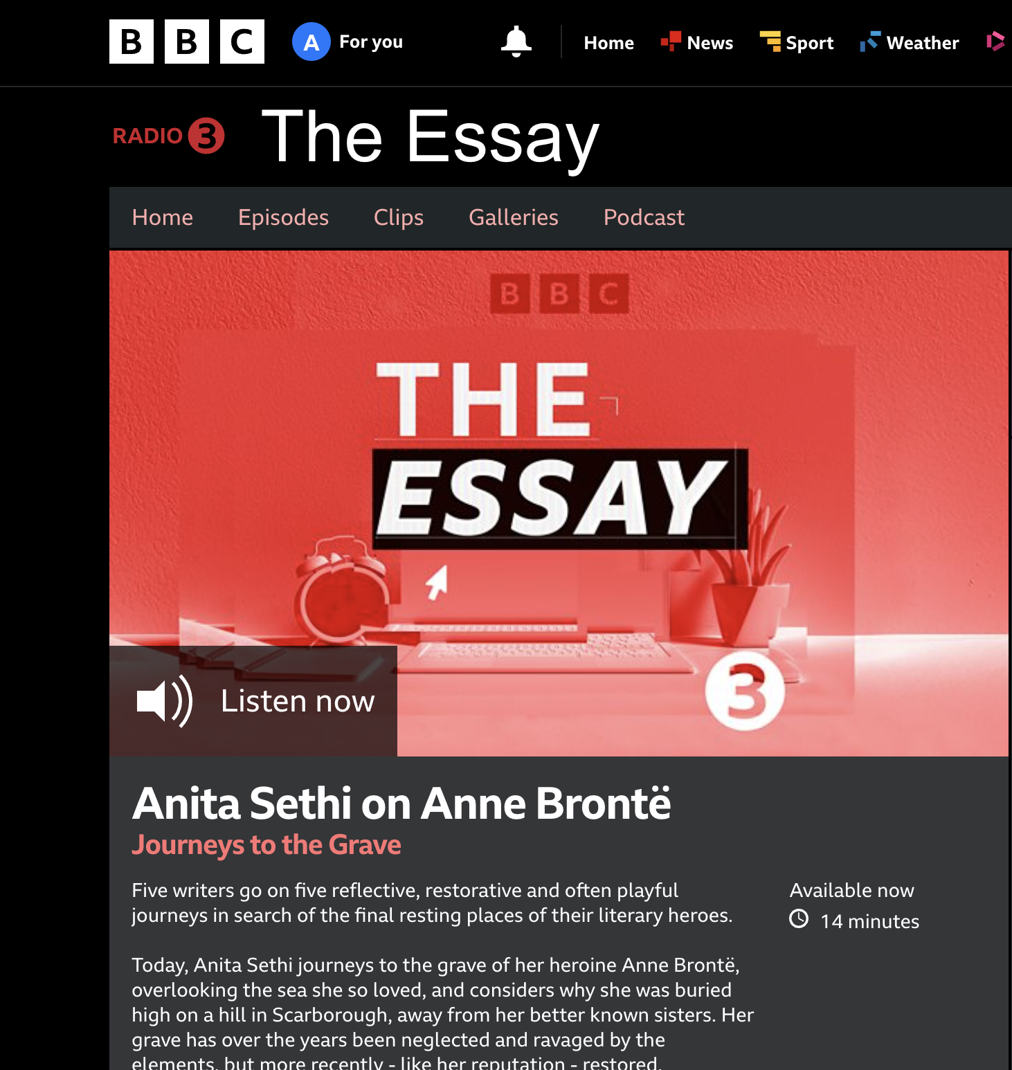 BBC Radio 3 – The Essay – (2022) https://www.bbc.co.uk/programmes/m00182c5 ‘Anita Sethi on Anne Brontë’