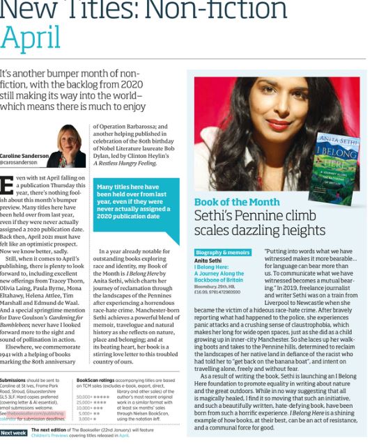 I BELONG HERE: A JOURNEY ALONG THE BACKBONE OF BRITAIN by Anita Sethi has been chosen as a Waterstones Best Book to Look Forward to in 2021.